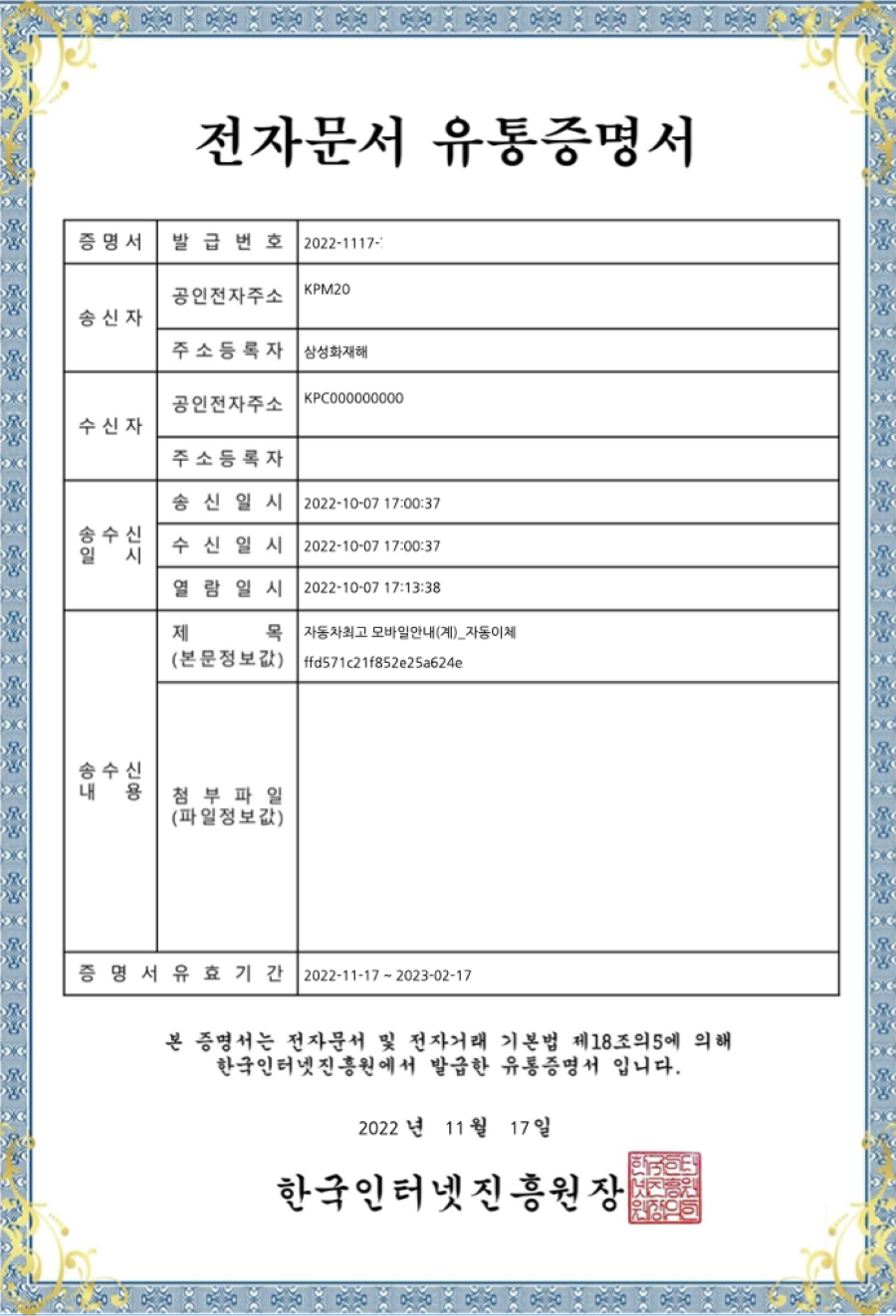 전자문서의 보관 사실, 작성자, 수신자 및 송신·수신 일시 등에 관한 사항을 “전자문서 및 전자거래기본법 시행령” 제15조의9, 제31조의7 2항에서 정한 방법과 절차에 따라 발급한 증명서
